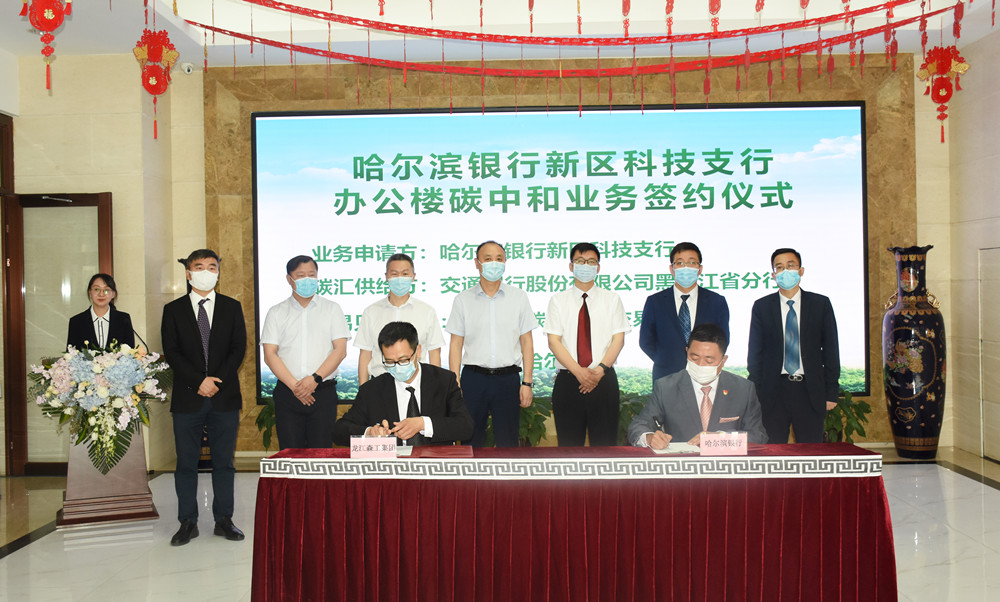 黑龍江碳排放權(quán)交易中心在簽約儀式上為哈爾濱銀行新區(qū)科技支行頒發(fā)了碳中和證明書。