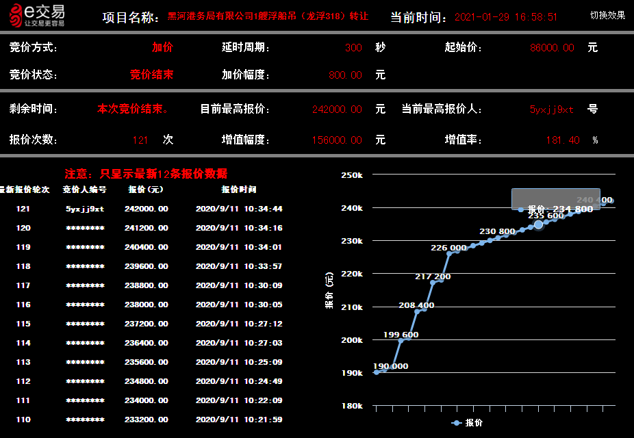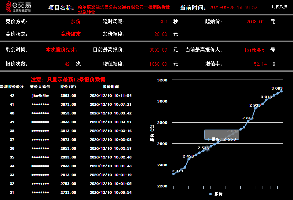 廢舊上游型蒸汽機車,轉讓底價62.33萬元,經(jīng)過60輪次的競價,最終成交價97.73萬元,增值率達56.79%。多艘廢舊駁船轉讓項目,轉讓底價240.85萬元,最終成交價431.89萬元,平均增值率達79.32%。其中,航運集團一艘浮船吊(龍浮318)轉讓項目,公告期滿,征集了30家意向方,報價次數(shù)達121次,最終以24.2萬元順利成交,增值率達181.40%。哈爾濱交通集團公共交通公司1117臺報廢公交車轉讓項目,轉讓底價1069.63萬元,成交價1097.63萬元,增值28萬元;一批消防拆除設施轉讓項目,轉讓底價2033元/噸,成交價3093元/噸,增值率高達52.14%。