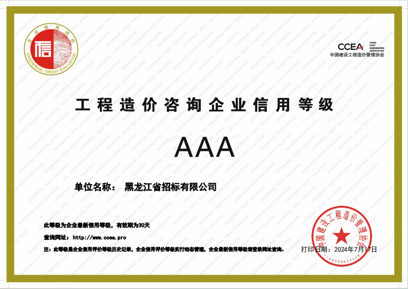 日前,中國建設(shè)工程造價(jià)管理協(xié)會(huì)發(fā)布了2024年第一批工程造價(jià)咨詢企業(yè)信用評(píng)價(jià)結(jié)果,黑龍江省招標(biāo)有限公司憑借專業(yè)的實(shí)力、優(yōu)質(zhì)的服務(wù)和良好的企業(yè)信譽(yù),榮獲了“工程造價(jià)咨詢企業(yè)AAA級(jí)”信用評(píng)價(jià)。