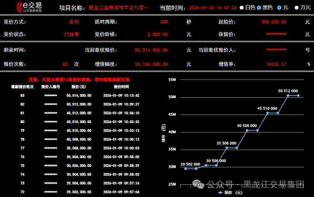 歷經(jīng)4711輪市場(chǎng)競(jìng)價(jià),最終以平均溢價(jià)4035.72%的價(jià)格成交!近日,受省自然資源廳委托,在黑龍江交易集團(tuán)自然生態(tài)交易中心掛牌出讓的第3批次金屬礦勘查等11個(gè)區(qū)塊探礦權(quán)出讓項(xiàng)目全部順利成交,成交價(jià)格創(chuàng)下黑河地區(qū)礦產(chǎn)資源出讓新高。這充分彰顯了自然生態(tài)交易中心市場(chǎng)平臺(tái)要素資源高質(zhì)高效配置功能作用,為龍江自然生態(tài)資源通過市場(chǎng)手段,實(shí)現(xiàn)資源向產(chǎn)業(yè)、要素向動(dòng)能轉(zhuǎn)化路徑的實(shí)踐樣本。